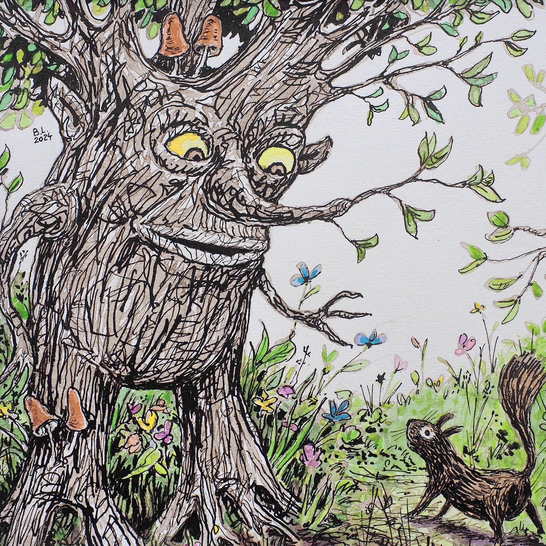 kolorierte Tuschezeichnung auf Aquarellpapier.