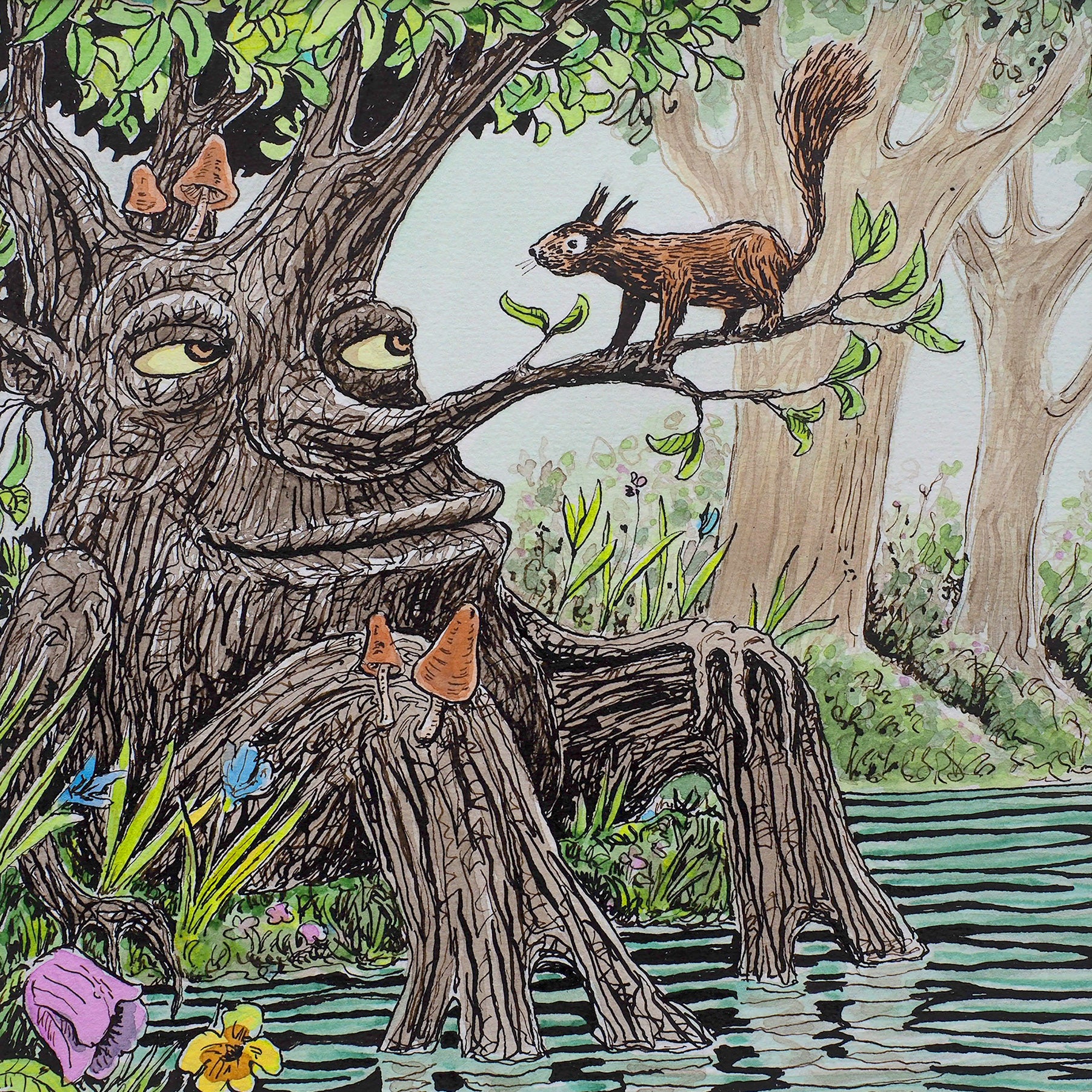 kolorierte Tuschezeichnung auf Aquarellpapier.